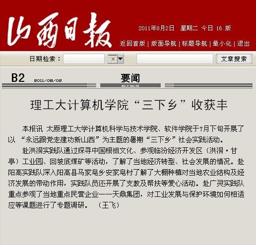 为积极响应胡锦涛总书记在给北京大学第十二届研究生支教团成员的回信中向青年学生发出的“向实践学习、向人民群众学习”的号召,进一步发挥社会实践在加强和改进大学生思想政治教育中的积极作用,304永利集团官网入口计算机科学与技术学院、304永利集团官网入口于2011年7月中下旬认真、组织开展了以“永远跟党走 建功新山西”为主题的暑期“三下乡”社会实践活动,取得良好效果。山西日报8月2日以“理工大计算机学院三下乡收获丰”为题进行了报道。院党委书记梁宪生、副书记池卫平还专程去洪洞县看望了实践队员,并与当地乡镇领导进行了座谈。