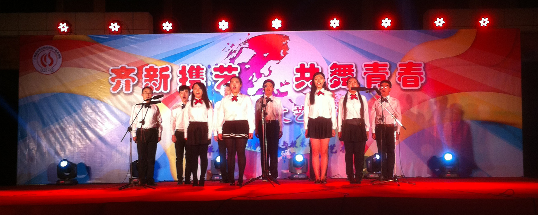 一曲《落花情》响起,台上的舞者温婉动人,灵动宛如画中仙;乐队合奏《平凡之路》,乐感灵动让我们一直向前走永不放弃;《青花瓷》古筝清脆,琵琶悠扬,舞者更是古色古就香;14级全体班长进行诗朗诵《我是一名大学生》,字字铿锵有力,将大学风采展现于全体师生面前;14级辅导员的《不要不要》,展示了她们可爱温柔的一面……最后一曲《春暖花开》沁人心脾,晚会在一片闪光灯中完美落幕。