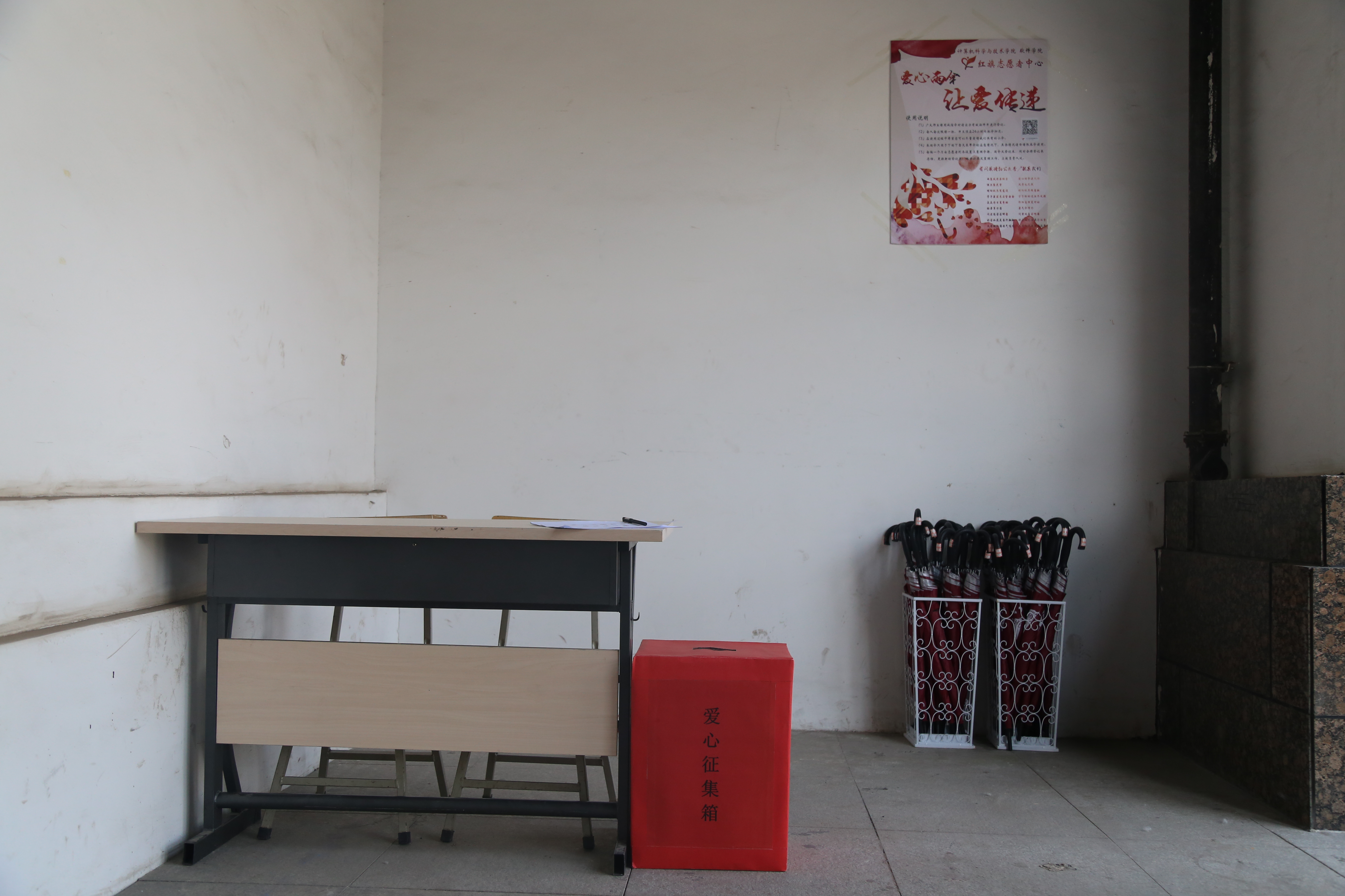 活动中设有爱心征集箱,如果大家认为我们的活动有意义,切实帮助到了大家,可以奉献自己的小小爱心,钱不在多,征集的是心意征集过程中得到的资金将会用于日后雨伞的维修。