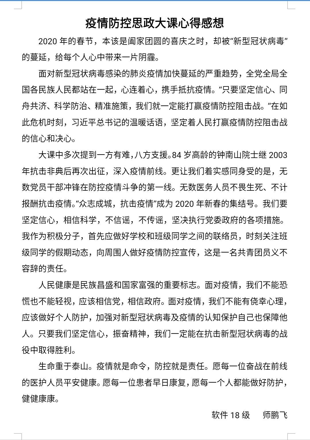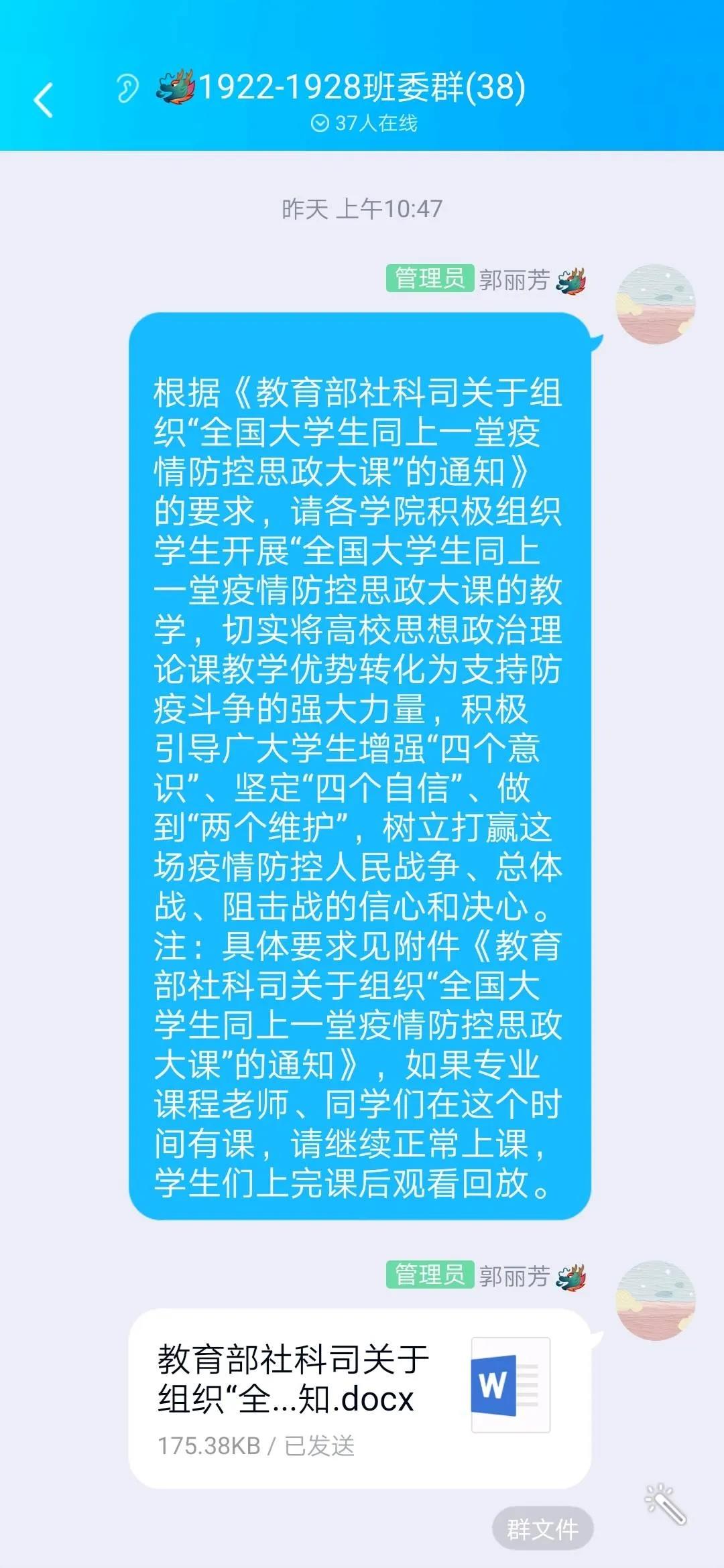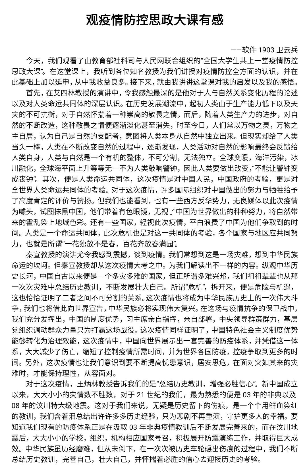 此次疫情防控思政大课对于学生们而言意义非凡,全国青年学生同关注、心连心,不仅深刻认识到在此次抗疫过程中彰显的中国共产党领导和中国特色社会主义制度的显著优势,更加坚定四个自信;而且愈加深切明白了当代青年人的责任与使命,大写的青春需要胸有大志、心有大我、肩有大任、行有大德。生于种花家,何其荣幸。我们坚信在党中央的正确领导下,一定可以打赢这场疫情防控阻击战!