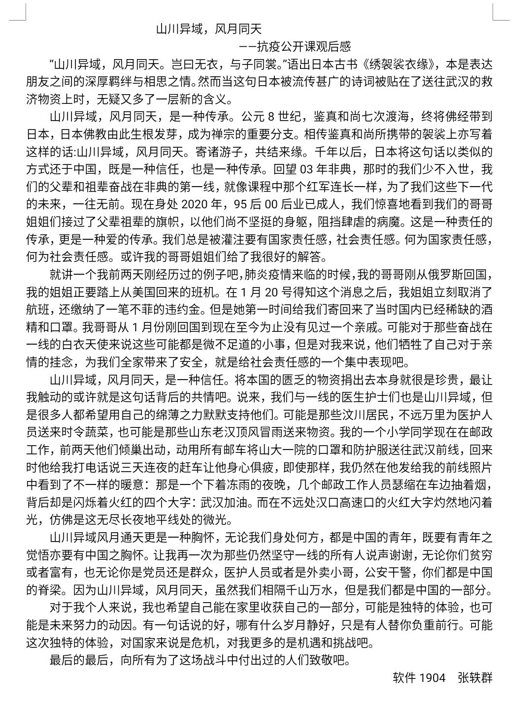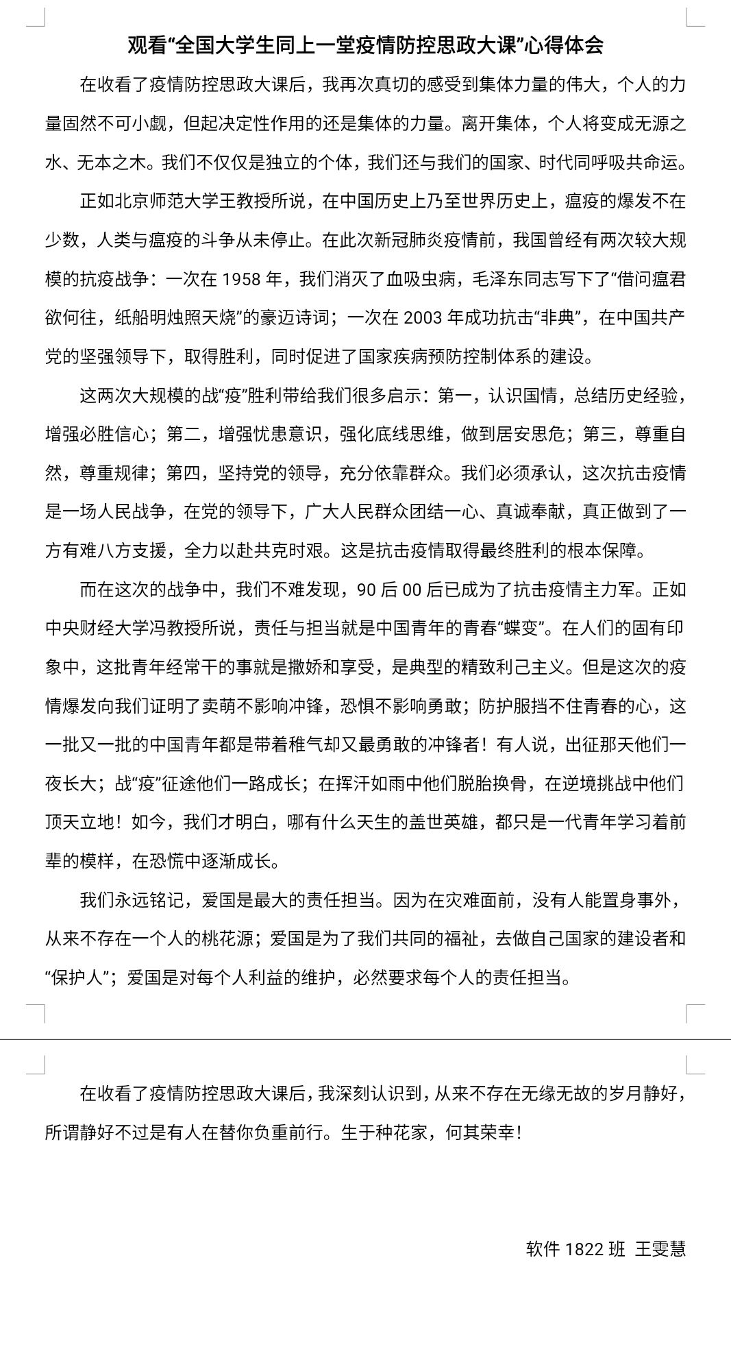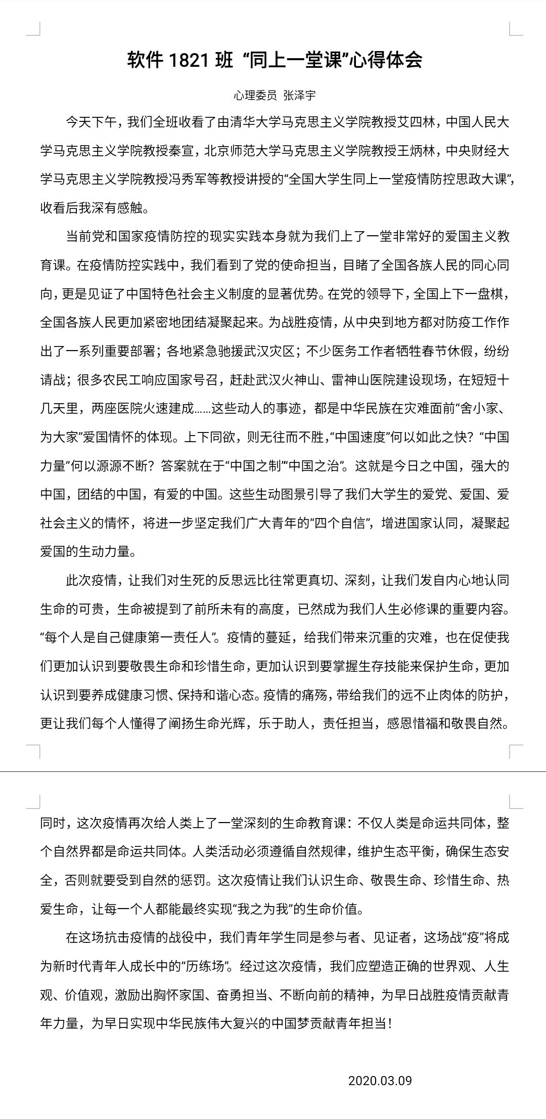 此次疫情防控思政大课对于学生们而言意义非凡,全国青年学生同关注、心连心,不仅深刻认识到在此次抗疫过程中彰显的中国共产党领导和中国特色社会主义制度的显著优势,更加坚定四个自信;而且愈加深切明白了当代青年人的责任与使命,大写的青春需要胸有大志、心有大我、肩有大任、行有大德。生于种花家,何其荣幸。我们坚信在党中央的正确领导下,一定可以打赢这场疫情防控阻击战!
