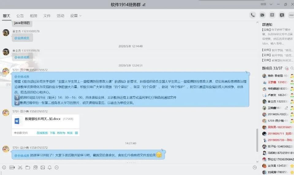 3月9日14:30辅导员准时组织学生们进行线上观看,在及时处理了开课前期直播平台崩溃无法正常观看思政大课的问题后,各级同学认真观看并及时记录课堂内容的重点要点。