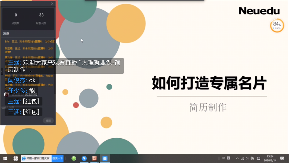 疫情期间增加了线上直播网课,并单独一对一指导学生简历与学生互动性强,学生学习意愿强烈。直播课录屏便于学生随时下载课程复习。从简历制作、面试技巧,自我介绍等各个环节对同学们的就业能力进行系统提升。