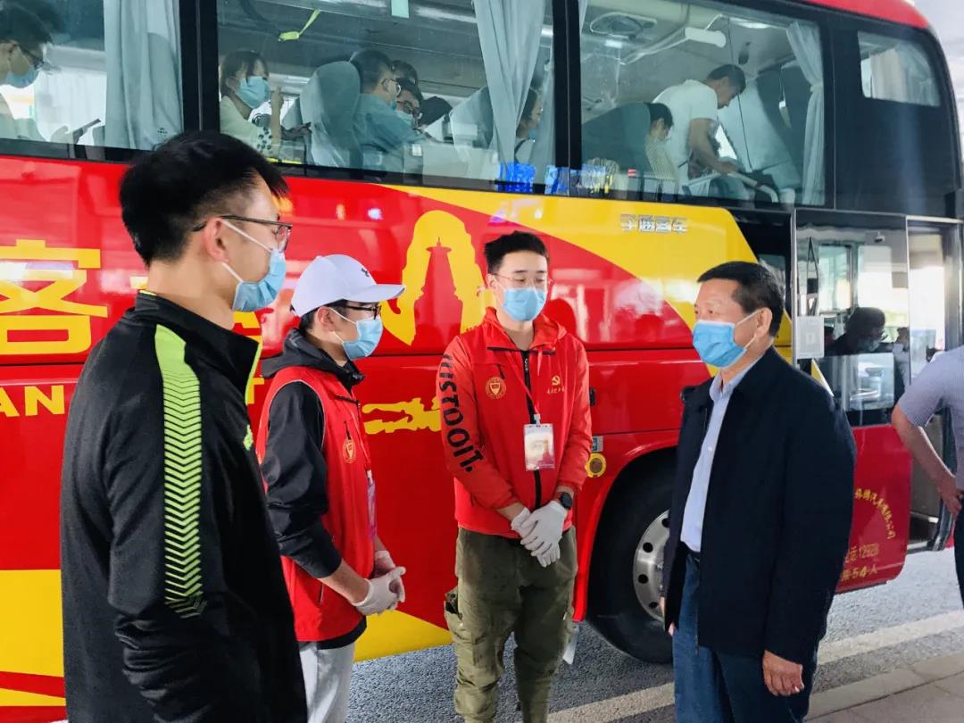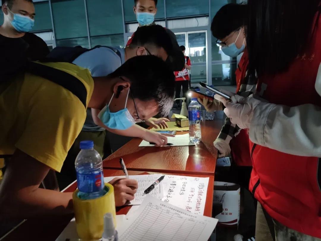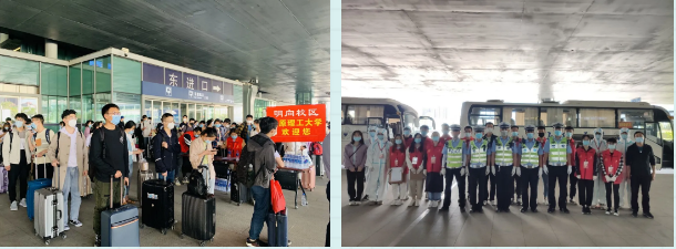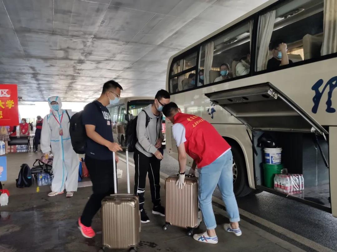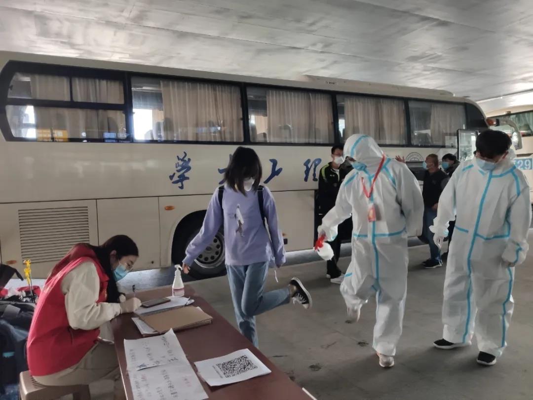 出站口引导,测量体温,身份核验,检查健康码,登记信息,行李消杀,搬运行李,安排座位……每个环节分工明确,井然有序。让到站的每位同学从一下车就能感受到学校的关怀备至,多了一份安心。