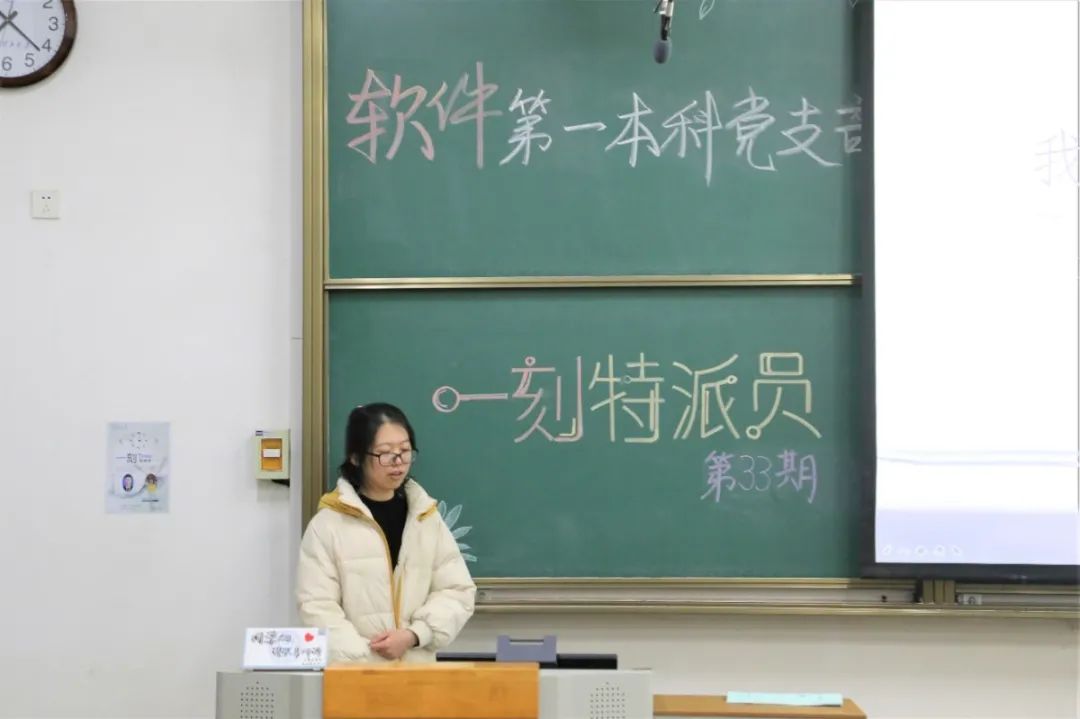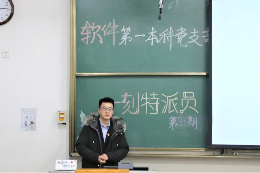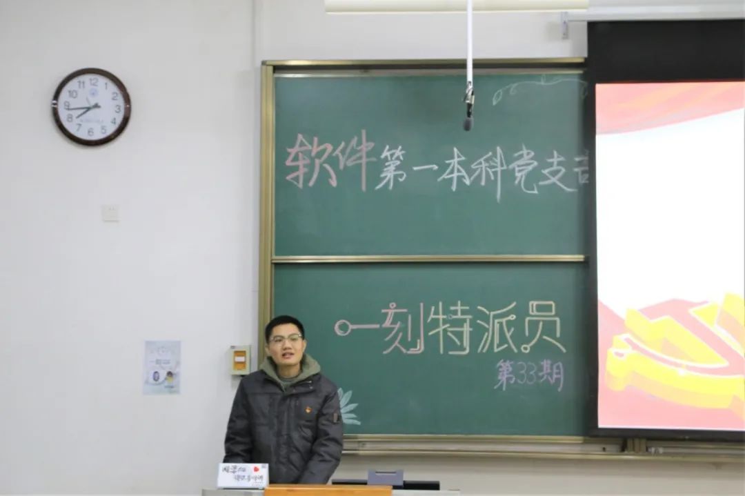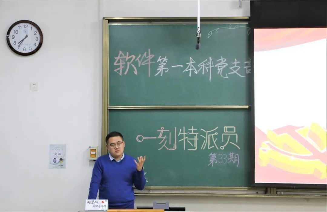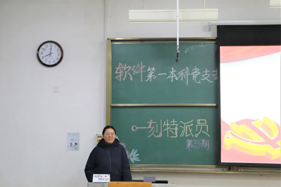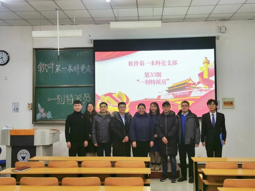 路漫漫其修远兮,吾将上下而求索。软件第一本科党支部第三十三期“一刻特派员”活动于12月14日19:00在行知楼B114成功举办。支部书记郭飞、组织委员张希琼、宣传委员梁明晶,以及卫晓鑫老师、王泽老师、刘煜川老师、雷毅老师、学生党员和入党积极分子参加了此次活动。