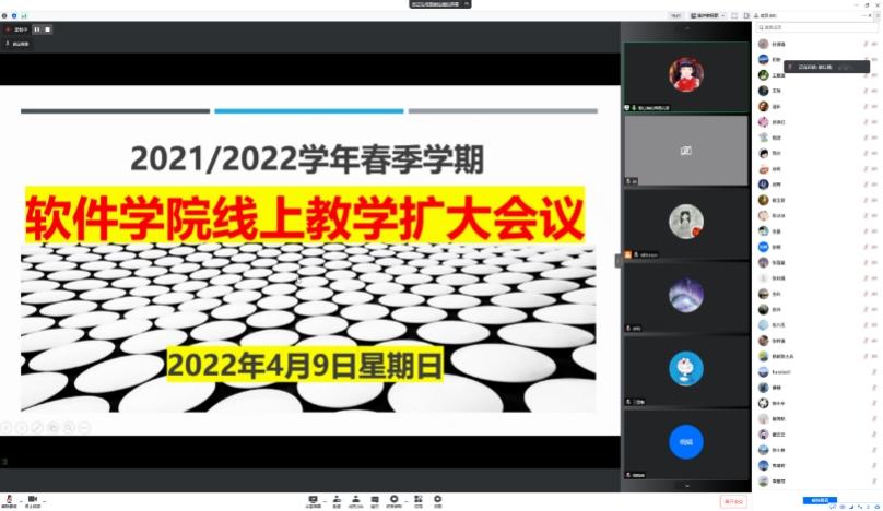 为进一步落实学校“防控不放松,学生不停学,教师不停教,质量有保障”的要求,保障304永利集团官网入口教学工作各方面有序推进,4月9日下午,学院召开了2021/2022年春季学期教学线上扩大会议,对学院教学工作进行了详细部署。本次会议由软件工程系主任谢红薇主持,校院督导组老师、院系部相关负责人、学工负责人、授课教师、实验室管理人员及研究生助教等70余名师生参加。