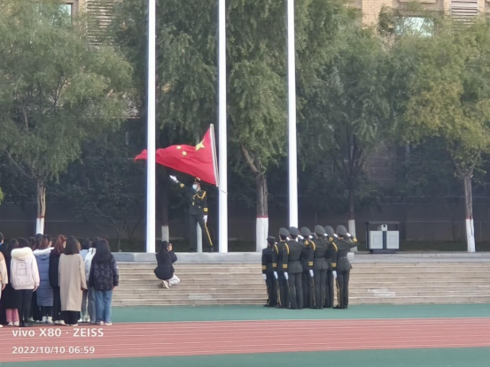 1528名新生,48个班级,快速集合之后,庄严的升旗仪式开始,国旗护卫队迈着铿锵的步伐将国旗护送至升旗台下。在场全体人员面向国旗,以注目礼的方式凝望着五星红旗冉冉升起!